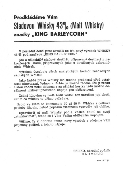 „Zavedením výroby whisky sledujeme obohacení trhu o výrobek získaný kvasnou cestou, vyráběný způsobem skotské whisky, avšak z tuzemských zdrojů, které pokládáme k tomuto účelu za velmi vhodné. Máme předpoklady k tomu, abychom si v oblasti Olomoucka zajistili vhodnou surovinu – slad,“ stojí v dokumentu, jehož pisatelé se netají – později skutečně naplněnou – ambicí vyvážet československou whisky do zahraničí.